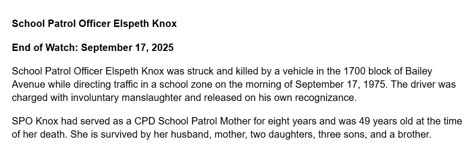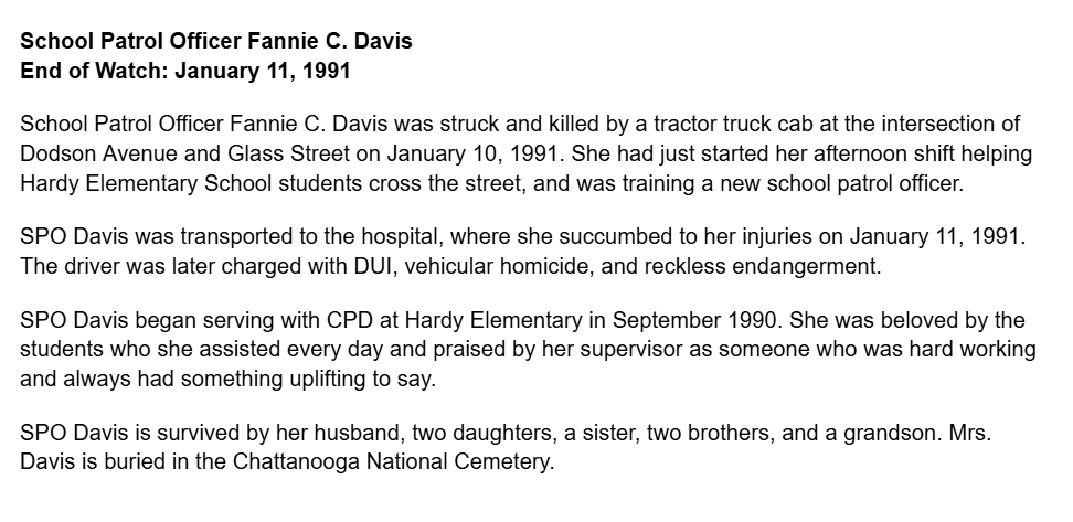 School Patrol Officer Fannie Davis was killed in an automobile crash on Janury 10th, 1991.